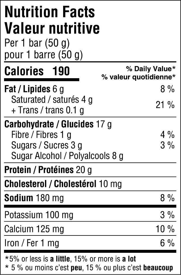 Ingredients: Protein blend (milk protein isolate, whey protein isolate, whey protein concentrate), Hydrolyzed gelatin, Glycerine, Cocoa, Water, Maltitol, Maltitol syrup, Modified palm kernel oil, Sugar, Whey protein concentrate, Whole milk powder, Chocolate liquor, Cocoa butter, Cocoa (processed with alkali), Peanut Flour, Milk fat, Almond butter, Calcium carbonate, Soy lecithin, Sucralose, Natural flavours
