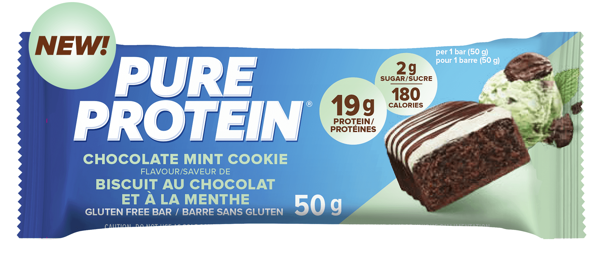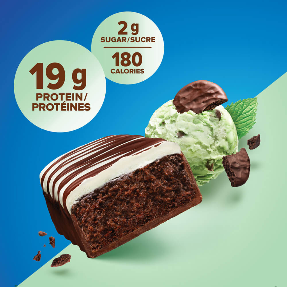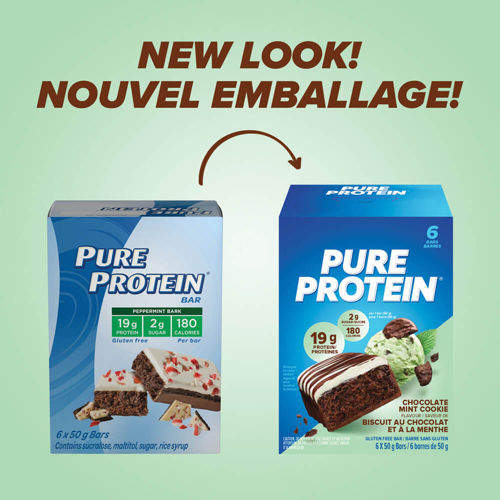 NEW LOOK! The perfect on-the-go protein snack! Chocolate Mint Cookie Pure Protein bar supports your busy and active lifestyle. Protein is an essential part of a nutritious, balanced diet. This bar is a delicious snack any time of day. Packed with 19 grams of protein, 2 grams of sugar and 180 calories.