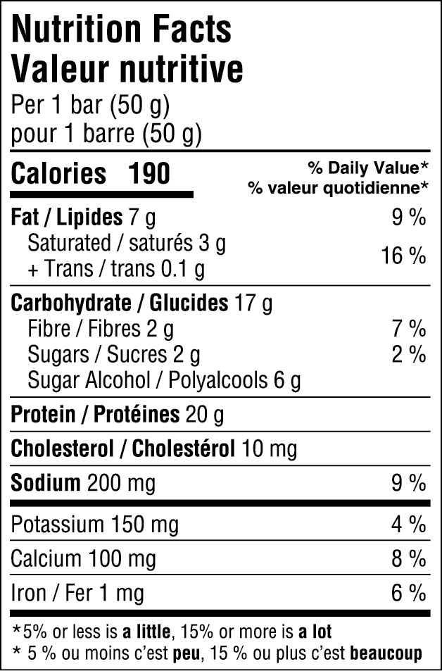 Ingredients: Hydrolyzed gelatin, Peanut flour, Protein blend (milk protein isolate, whey protein isolate, whey protein concentrate), Glycerine, Maltitol syrup, Soy protein isolate, Water, Maltitol, Peanuts, Modified palm kernel oil, Whey protein concentrate, Peanut oil, Sugar, Tapioca starch, Cocoa (processed with alkali), Natural flavours, Salt, Calcium carbonate, Soy lecithin, Sucralose, Almond butter, Vanilla extract