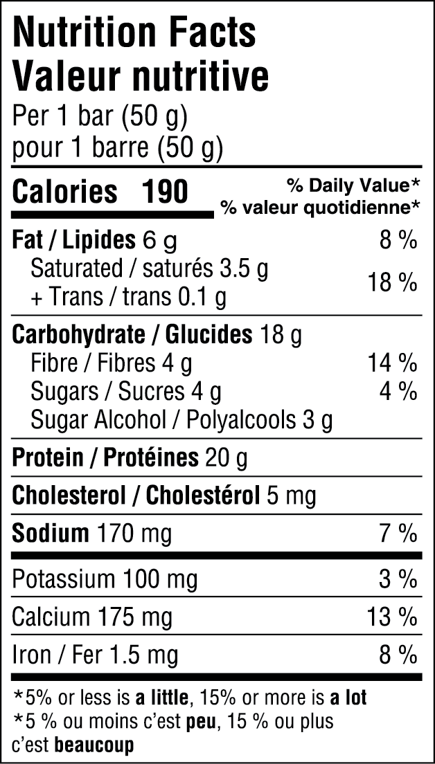 Ingredients: Protein blend (milk protein isolate, whey protein isolate, acid casein, partially hydrolyzed whey protein isolate), Glycerine, Hydrolyzed gelatin, Soy protein isolate, Sugars (cane sugar syrup, brown rice syrup, sugar, cane sugar), Tapioca fiber syrup, Milk protein concentrate, Palm kernel oil, Erythritol, Cocoa, High oleic sunflower oil, Chocolate liquor, Yogurt powder (whey protein concentrate, skim milk powder, bacteria cultures), Fructooligosaccharides, Tapioca starch, Brown crisp rice, Whey protein isolate, Water, Whey protein concentrate, Modified palm oil, Milk protein isolate, Chicory root fiber, Palm oil, Salt, Soy lecithin, Flaxseed, Vanilla, Sucralose, Sunflower lecithin, Natural flavours, Citric acid, Sodium phosphate, Tocopherols, Calcium carbonate