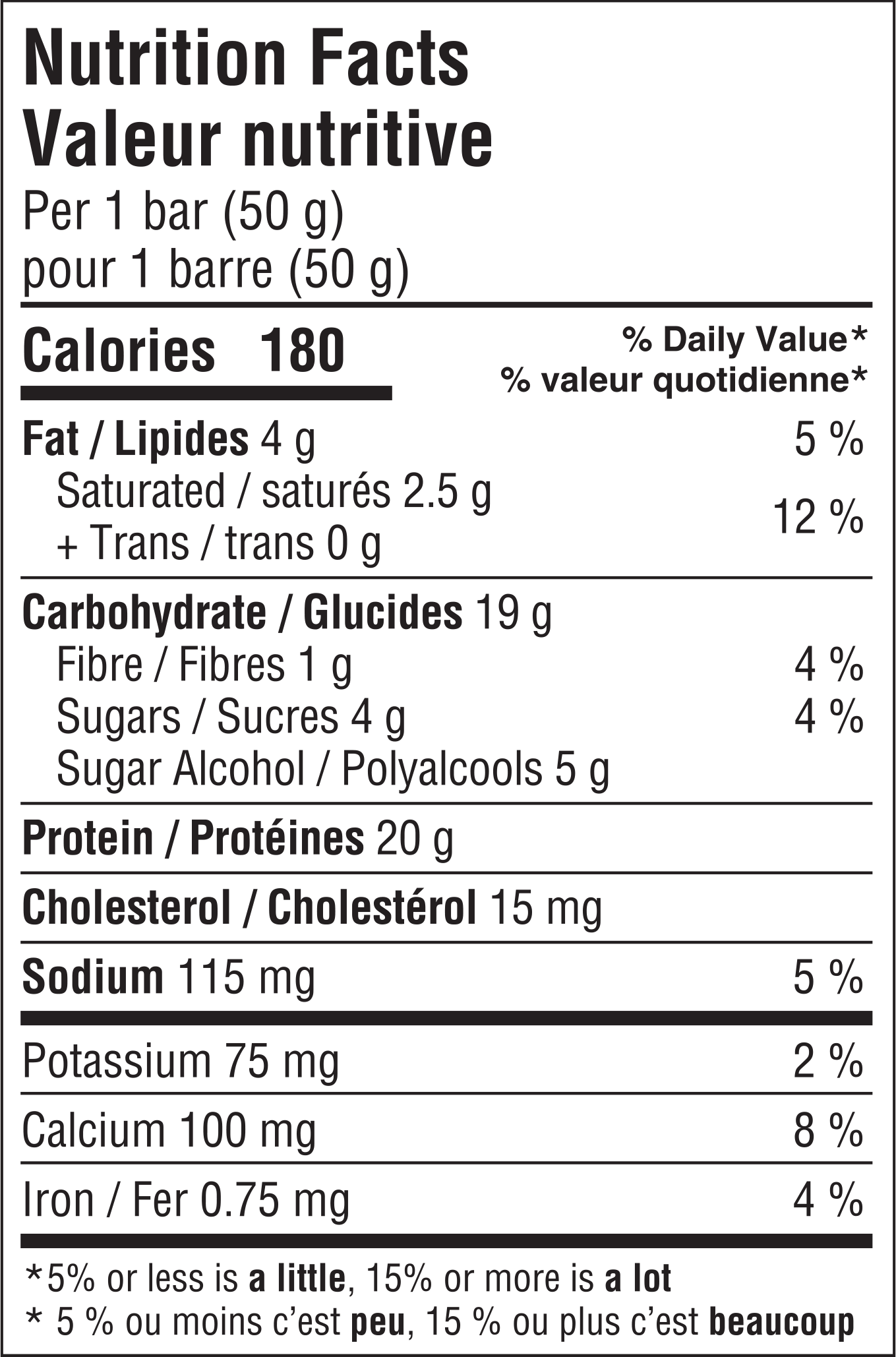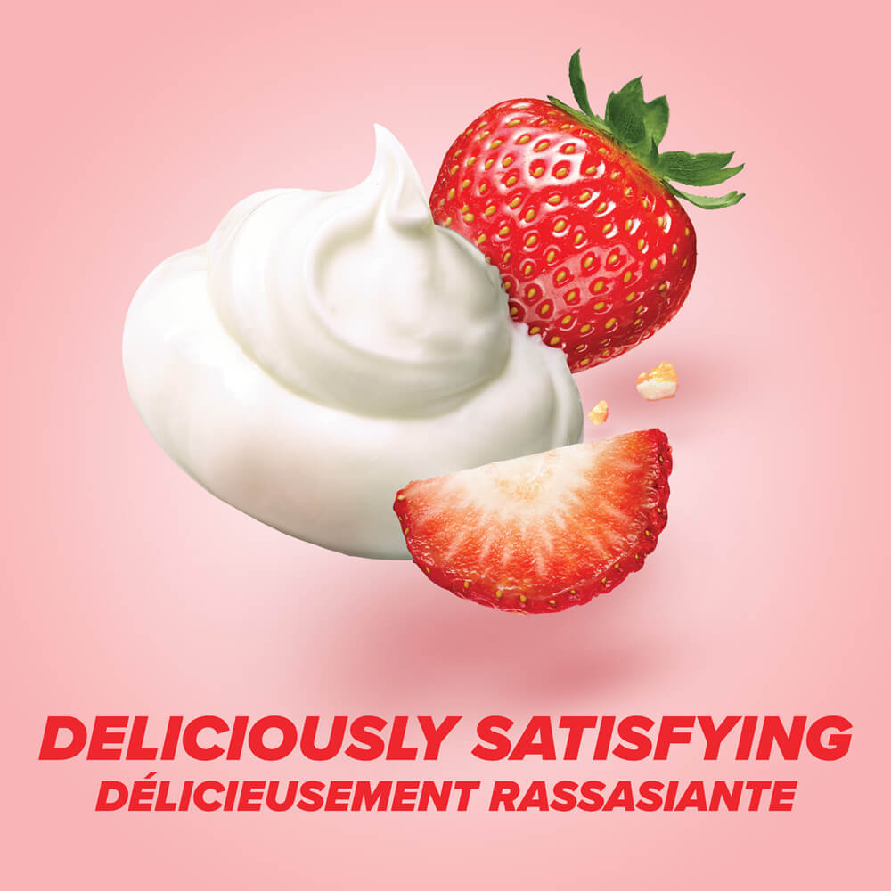 Ingredients: Hydrolyzed gelatin, Protein blend (whey protein isolate, soy protein isolate, milk protein isolate), Sugars (maltodextrin, sugar, fructose, dextrose, corn syrup), Soy protein isolate, Water, Whey protein concentrate, Modified palm kernel oil, Canola oil, Corn starch, Tapioca starch, Greek yogurt powder, Skim milk, Dried strawberries, Salt, Peanut flour, Almond butter, Glycerine, Maltitol syrup, Maltitol, Natural flavours, Citric acid, Soy lecithin, Lactic acid, Elderberry juice, Sweet potato juice, Cellulose gum, Sucralose, Tocopherols