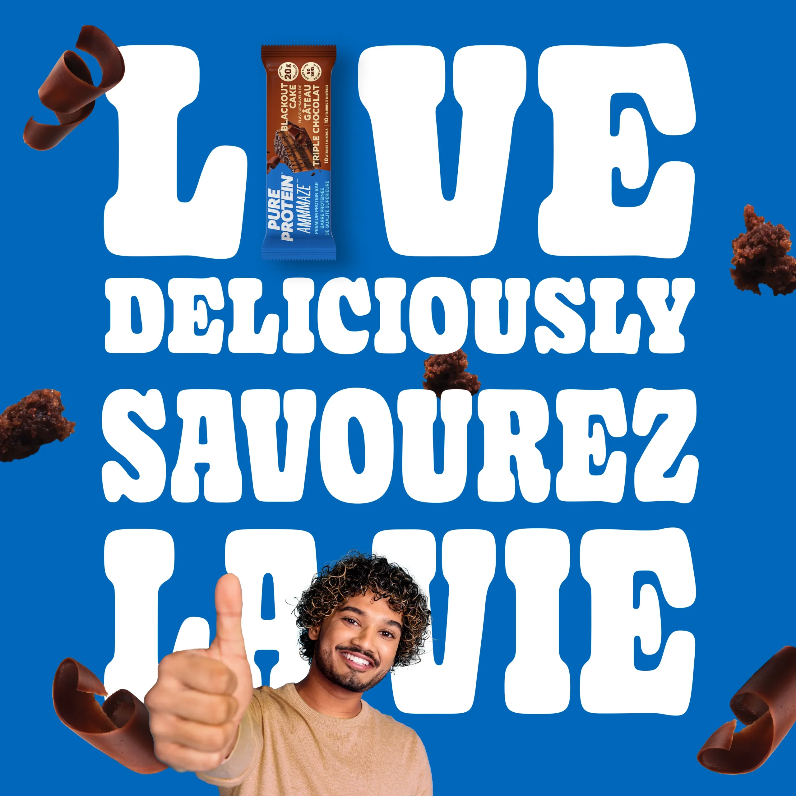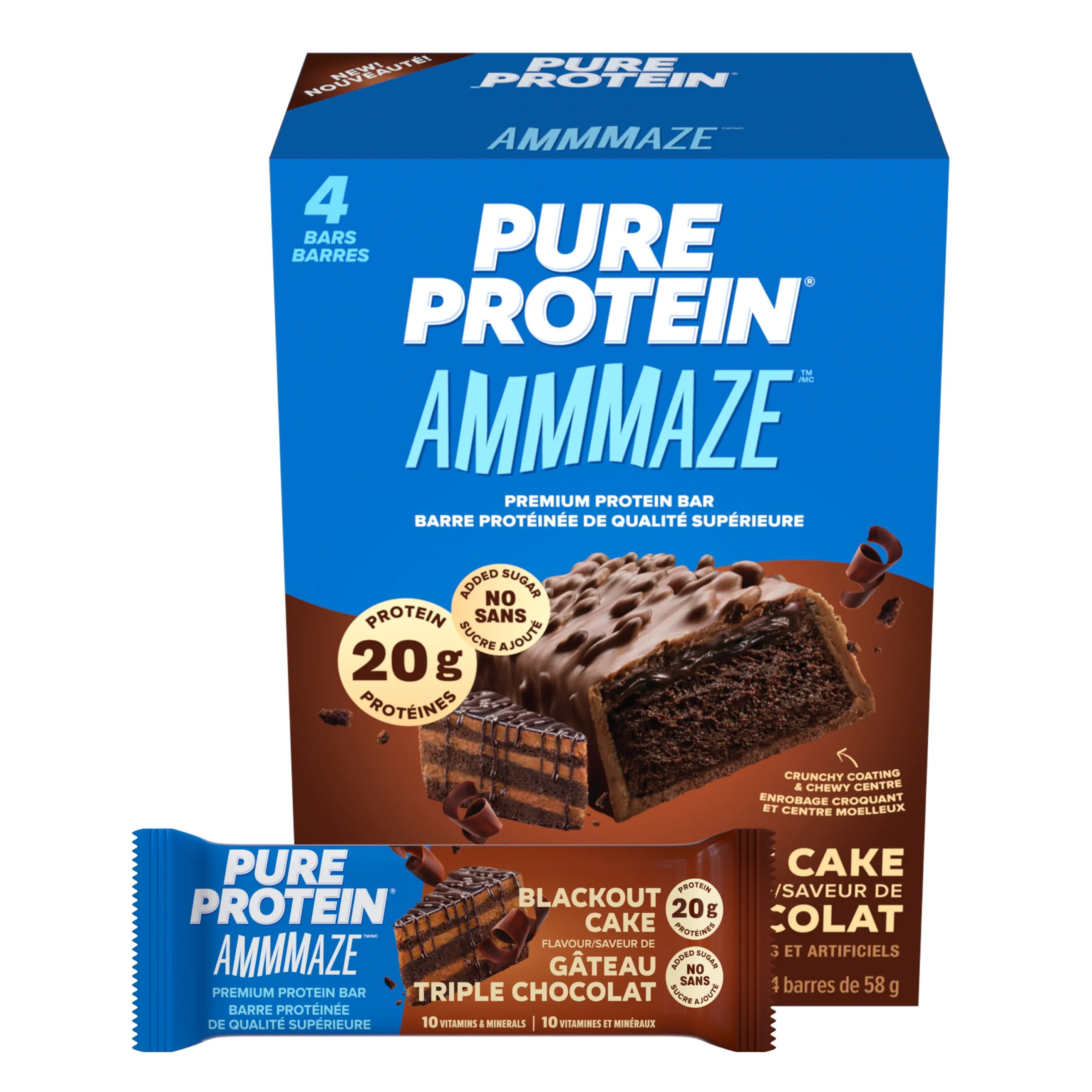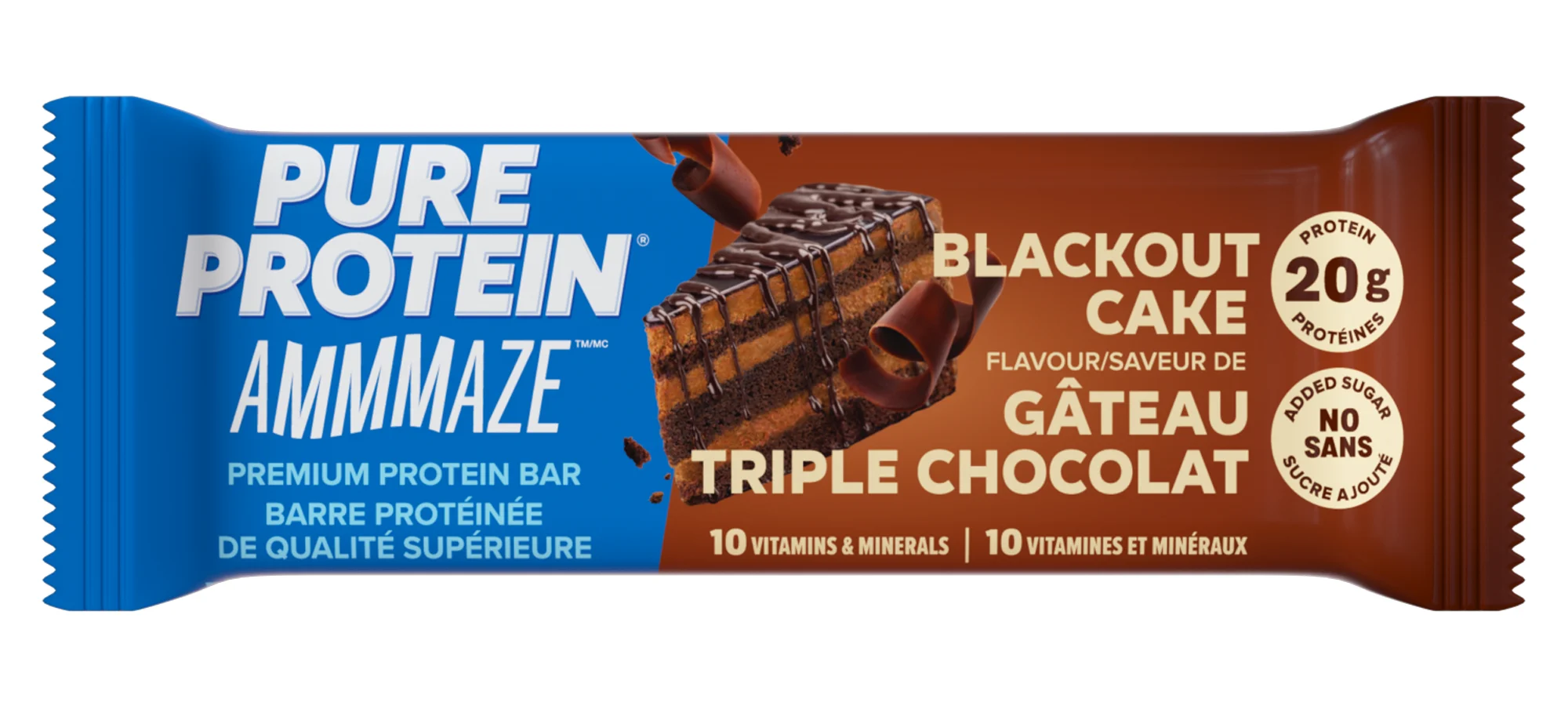 Pure Protein AMMMAZE Blackout Cake bars feature a rich, fudgy centre, dipped in a decadent milk chocolate coating and topped with crave-worthy chocolate crunchies.