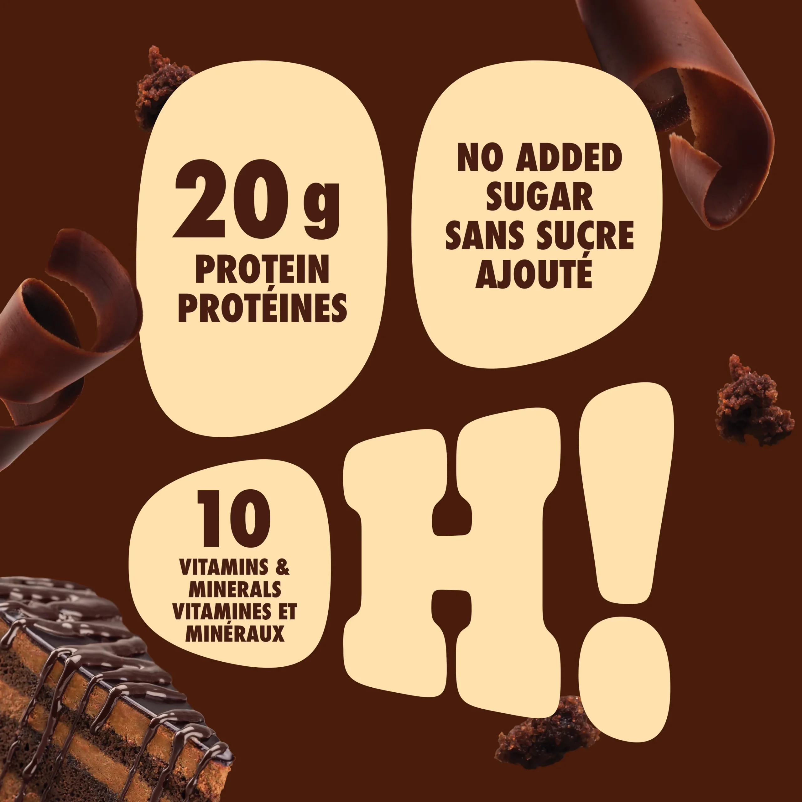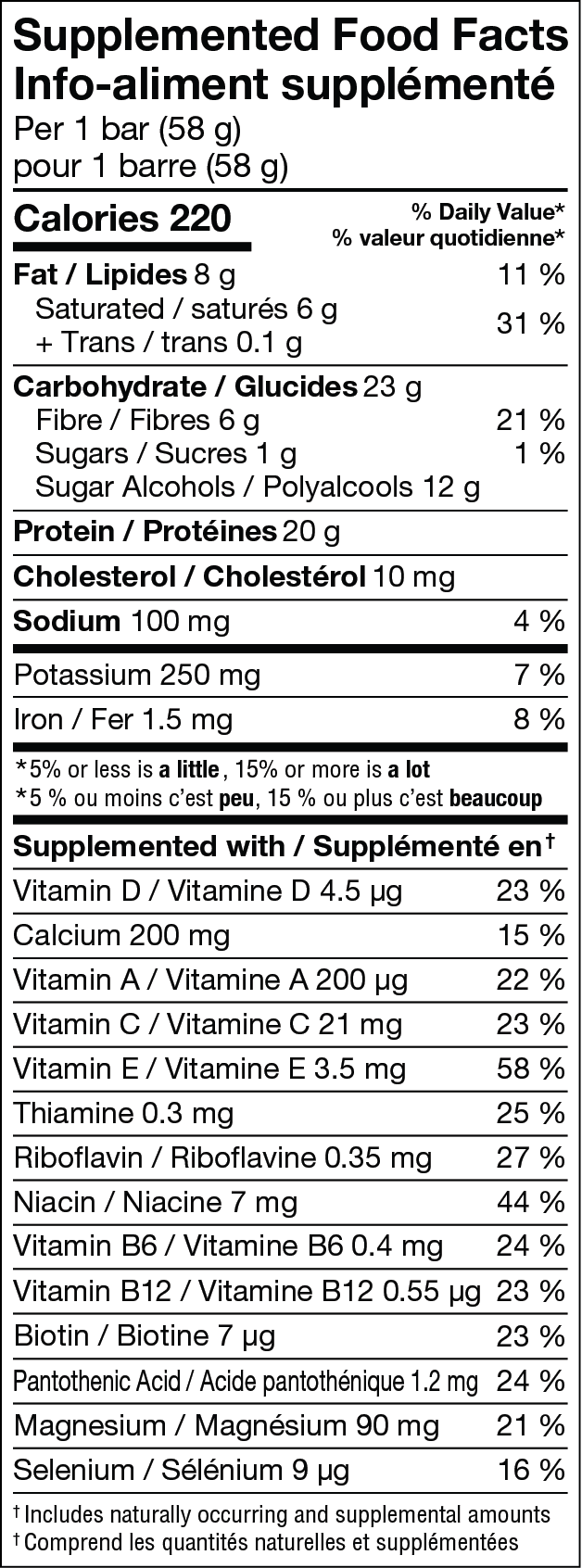 Ingredients: Protein blend (calcium caseinate, partially hydrolyzed whey protein isolate, partially hydrolyzed milk protein isolate, milk protein isolate), Glycerin, Gelatin, Palm kernel oil, Polydextrose (3.4g/serving), Whole milk powder, Maltitol, Chicory inulin, Palm oil, Maltitol syrup, Soy protein isolate, Water, Cocoa (processed with alkali), Sorbitol, Cocoa extract, Milk protein concentrate, Chocolate liquor, Salt, Soy lecithin, Cocoa, Tapioca starch, Stevia extract, Maltodextrin, Arabic gum, Locust bean gum, Xanthan Gum, Sucralose, Ethyl alcohol, Gum, Peanuts, Almond, Natural flavour, Magnesium, Vitamin C, Vitamin E, Niacin, Vitamin A, Pantothenic acid, Vitamin D, Vitamin B6, Thiamine, Riboflavin, Selenium, Biotin, Vitamin B12.