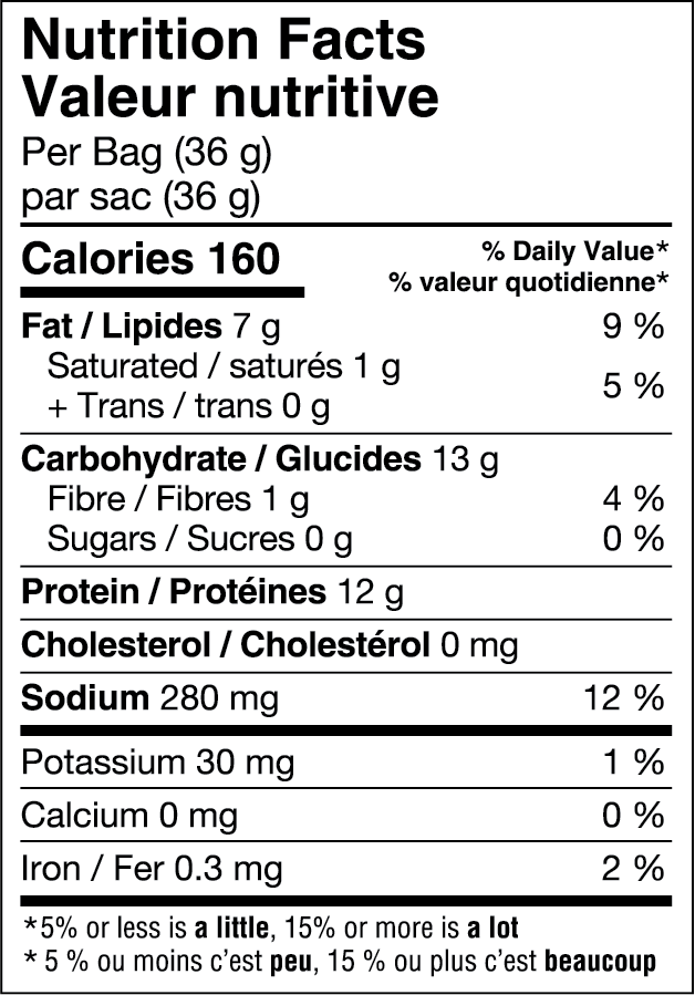 Ingredients: Pea protein, Lentil flour, Potato starch, Rice flour, Sunflower oil, Frank’s RedHot® Sauce (cayenne pepper, salt, vinegar solids, paprika, garlic powder, natural flavour), Garlic powder, Corn maltodextrin, Modified corn starch, Vinegar solids, Yeast extract, Coconut oil* (Medium chain triglycerides), Paprika extract, Spices, Citric acid, Malic acid, Natural flavour, Silicon dioxide. *May contain Palm oil.