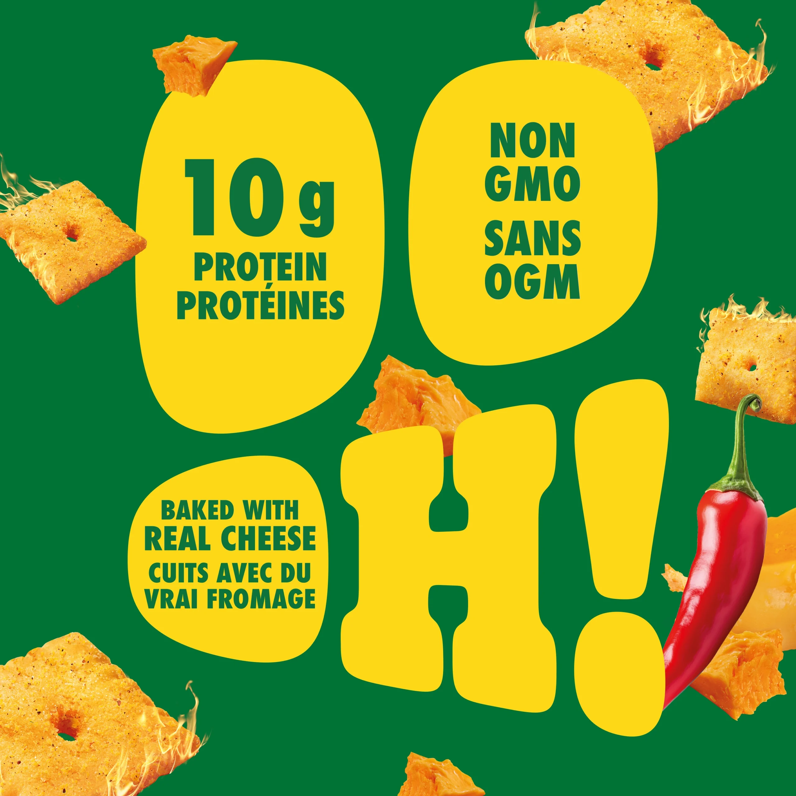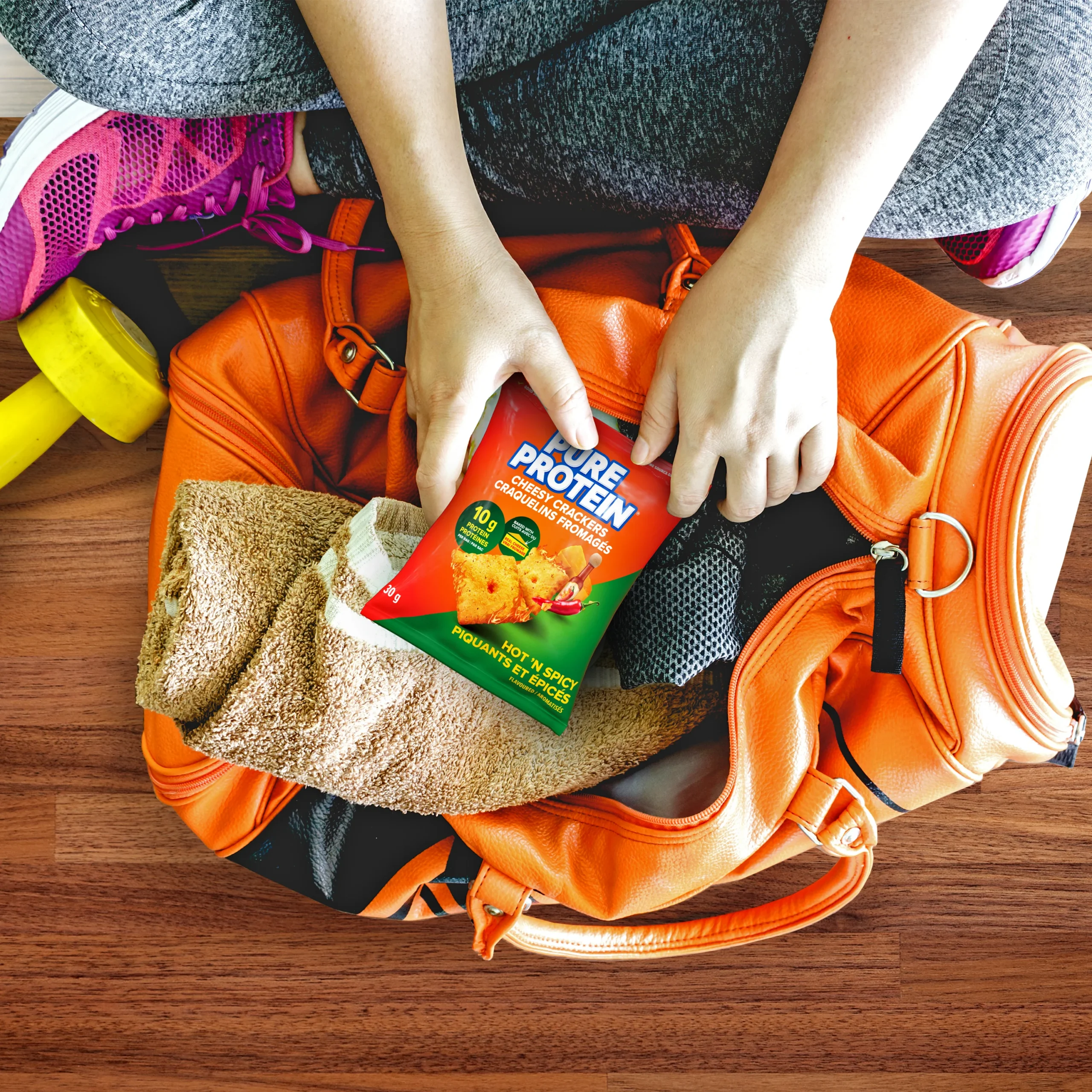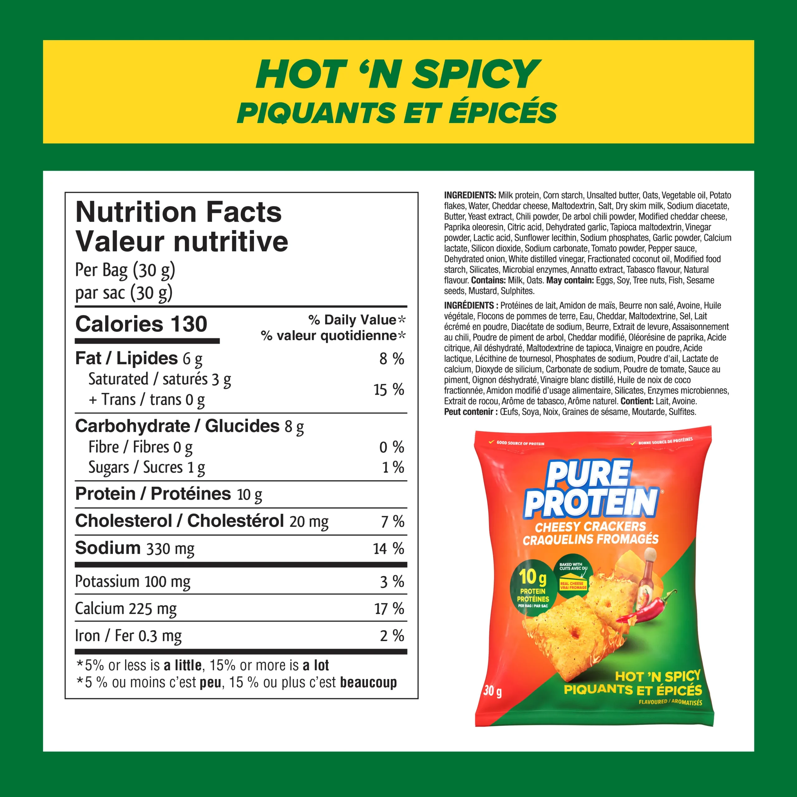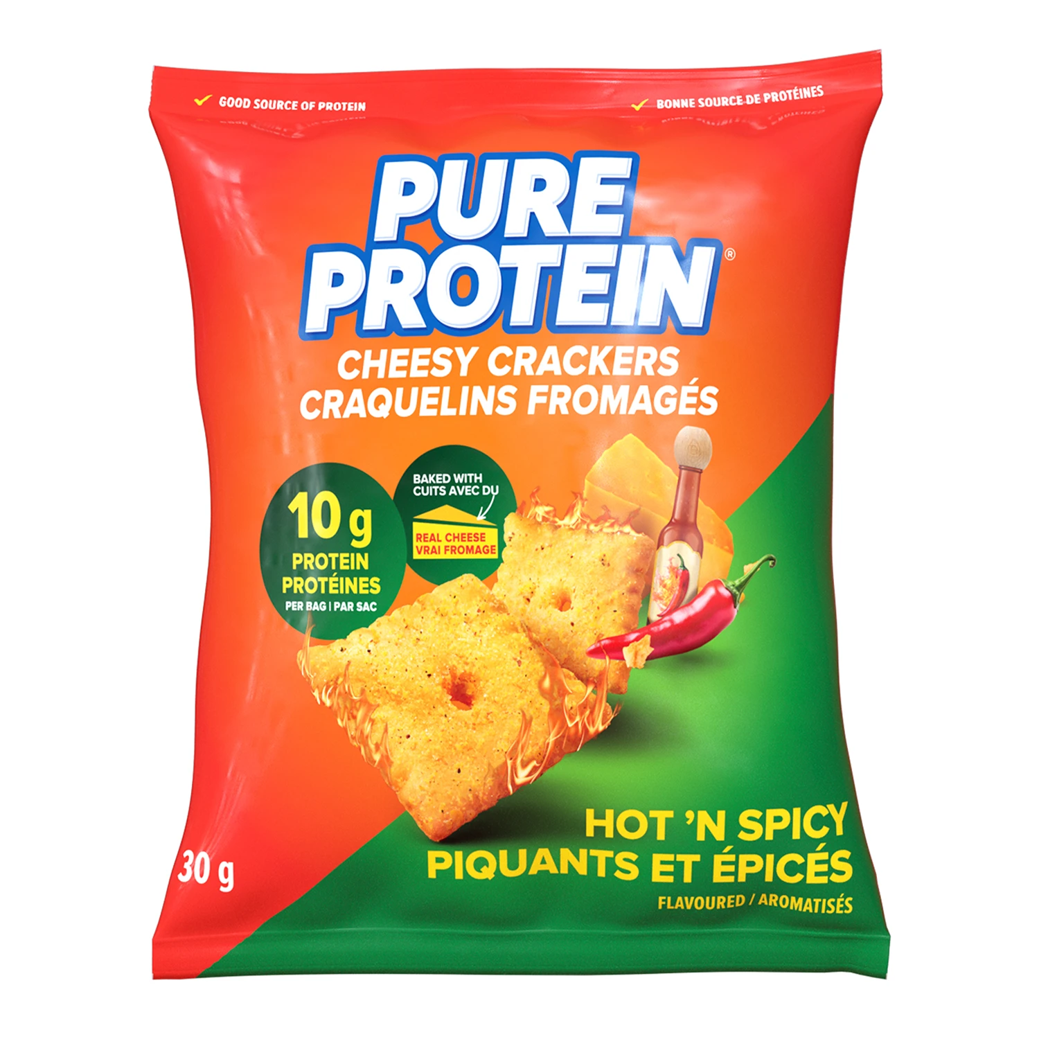 Pure Protein Hot ‘N Spicy Cheesy Crackers are the perfect bold flavour-packed snack. Crafted with 10 g of protein and only 130 calories. Made with real cheese with big spicy flavour to satisfy those crunchable cravings. Each delicious handful is non-GMO, has no trans fats, and includes calcium. Whether you’re snacking at home or looking for an on-the-go sports nutrition snack, Pure Protein Hot ‘N Spicy Cheesy Crackers come in individual packs for a delicious portable protein snack.