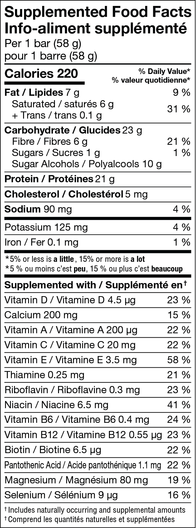 Ingredients: Protein blend (calcium caseinate, partially hydrolyzed whey protein isolate, partially hydrolyzed milk protein isolate, milk protein isolate), Gelatin, Glycerin, Palm oil, Maltitol, Polydextrose (4.1 g/serving), Chicory root fiber, Sugars (maltitol syrup, maltodextrin, strawberry juice concentrate), Whole milk powder, Water, Sorbitol, Whey protein concentrate, Rice flour, Milk protein isolate, Palm kernel oil, Medium chain triglycerides, Potato starch, Sunflower oil, Propylene glycol, Soy lecithin, Citric acid, Vanilla extract, Salt, Stevia extract, Sucralose, Red radish extract, Allura red, Titanium dioxide, Caramel (colour), Peanuts, Almond, Natural flavour, Artificial flavour, Magnesium, Vitamin C, Vitamin E, Niacin, Vitamin A, Pantothenic acid, Vitamin D, Vitamin B6, Thiamine, Riboflavin, Selenium, Biotin, Vitamin B12.