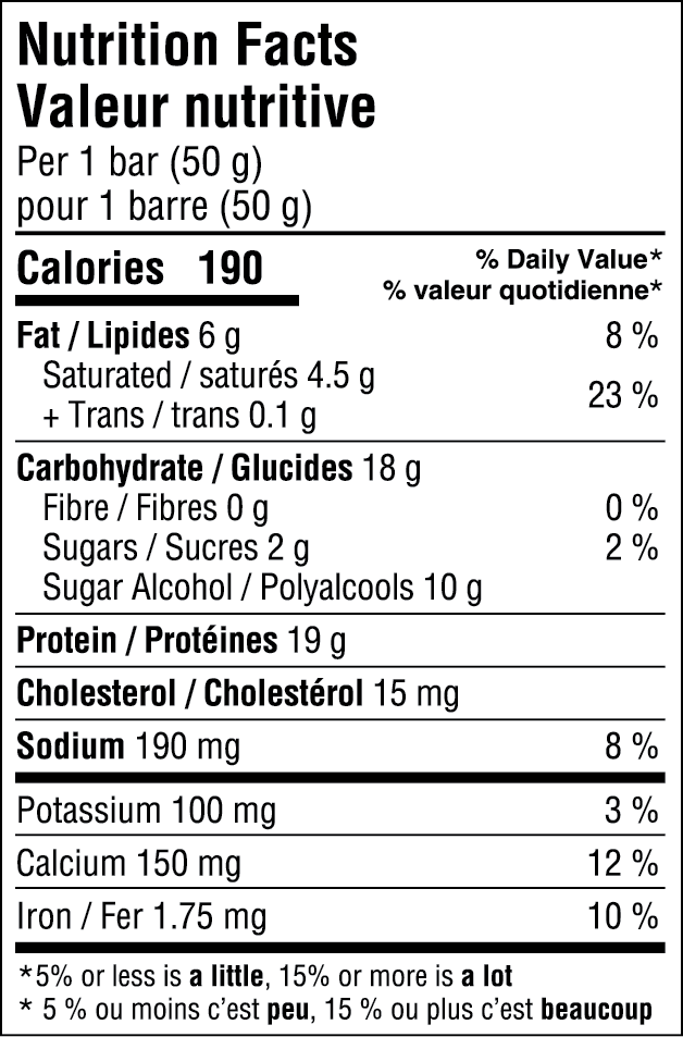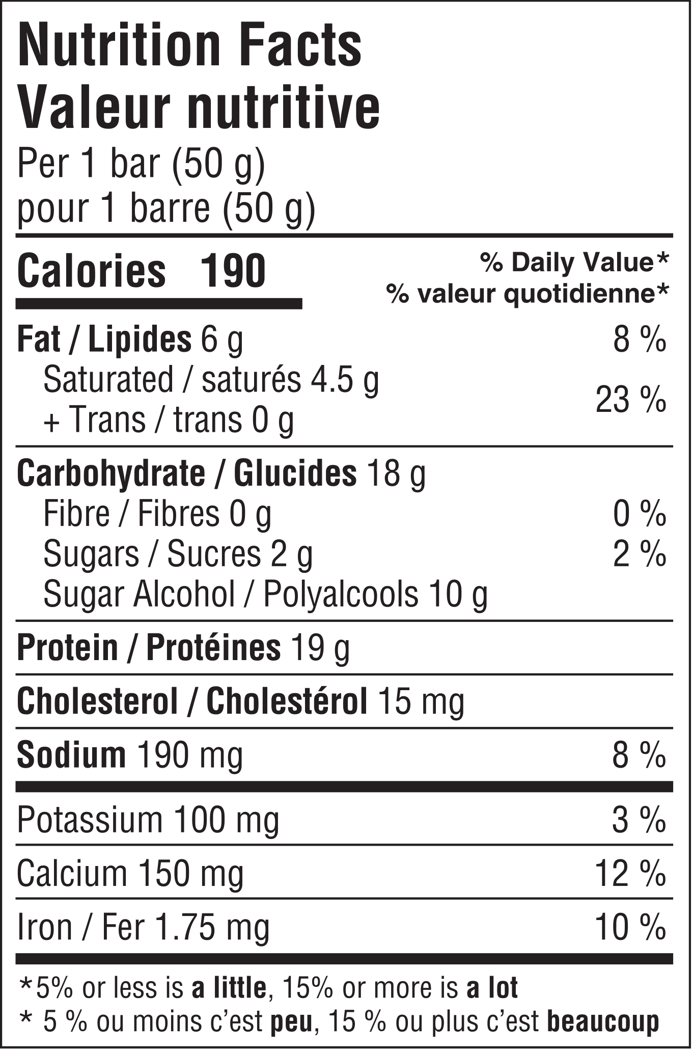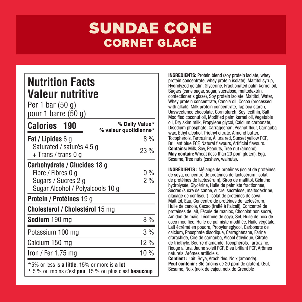 Ingredients: Protein blend (soy protein isolate, whey protein concentrate, whey protein isolate), Maltitol syrup, Hydrolyzed gelatin, Glycerine, Fractionated palm kernel oil, Sugars (cane sugar, sugar, sucralose, maltodextrin, confectioner’s glaze), Soy protein isolate, Maltitol, Water, Whey protein concentrate, Canola oil, Cocoa (processed with alkali), Milk protein concentrate, Tapioca starch, Unsweetened chocolate, Corn starch, Soy lecithin, Salt, Modified coconut oil, Modified palm kernel oil, Vegetable oil, Dry skim milk, Propylene glycol, Calcium carbonate, Disodium phosphate, Carrageenan, Peanut flour, Carnauba wax, Ethyl alcohol, Triethyl citrate, Almond butter, Tocopherols, Tartrazine, Allura red, Sunset yellow FCF, Brilliant blue FCF, Natural flavours, Artificial flavours