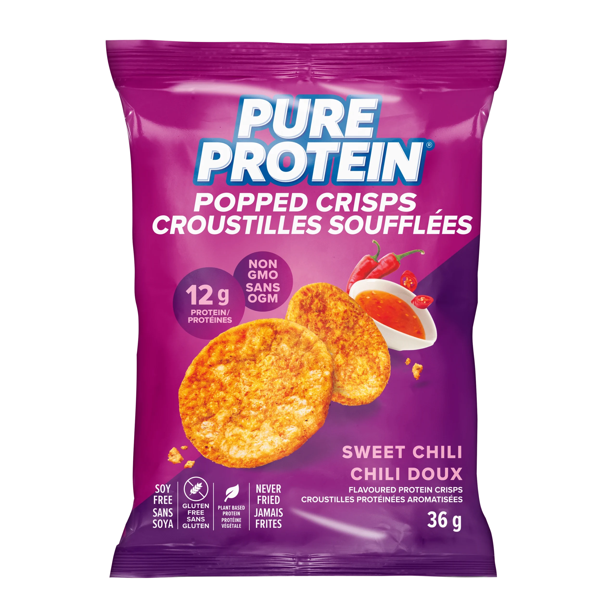 Take a bite of a protein snack that POPS! Pure Protein Sweet Chili Popped Crisps are a new flavour-packed protein snack to satisfy those crunchable cravings. Crafted with 12 g of protein, our Popped Crisps are big on flavour and crunch, yet never fried. They are made with plant-based protein and are gluten free, non GMO, and vegan friendly. They pack just enough heat to excite your tastebuds along with a touch of sweetness.
